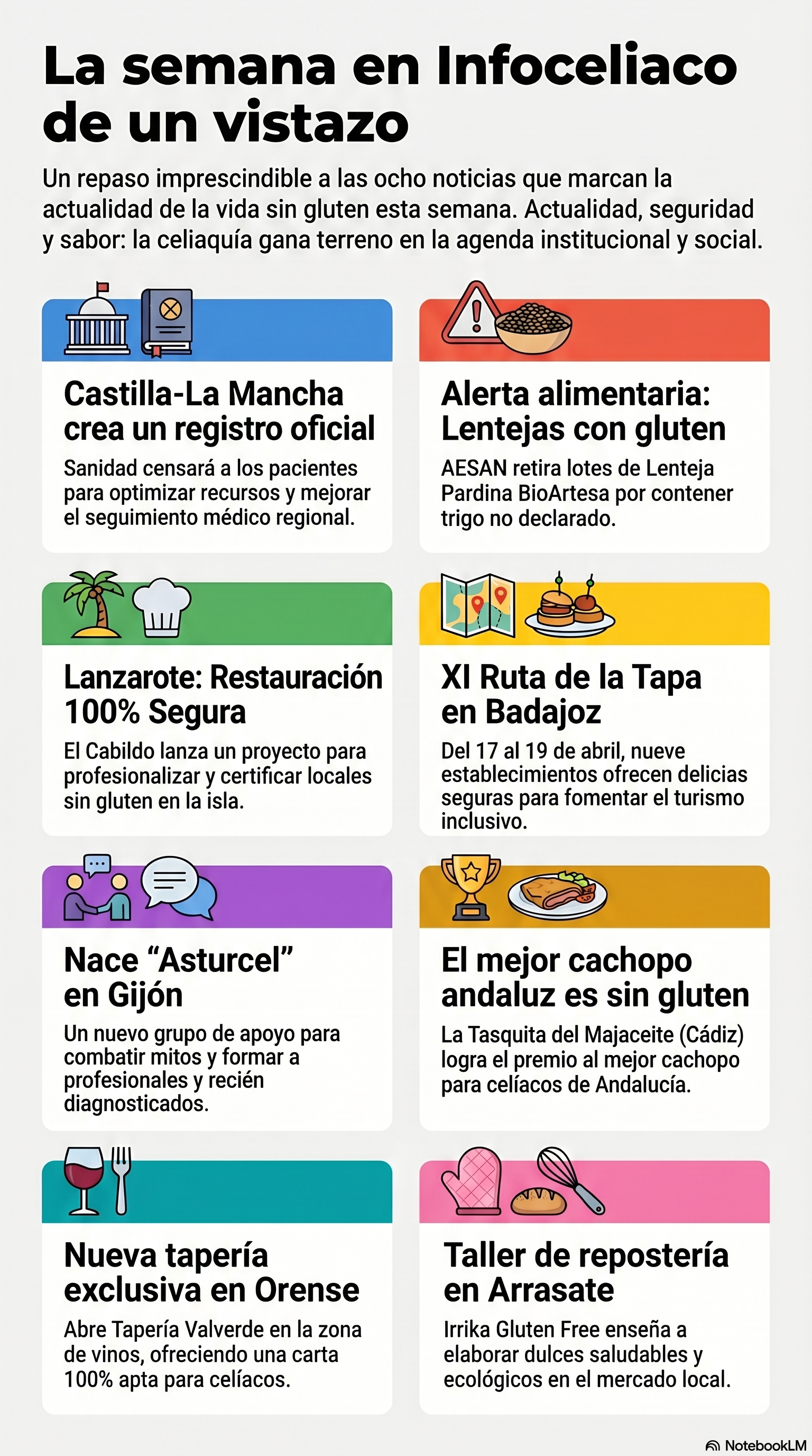 Arturo Cuervo La semana en Infoceliaco de un vistazo (17 de Abril de 2026)... Next Article Nace "Asturcel", un aliado para los celíacos asturianos últimas noticias La semana en Infoceliaco de un vistazo (17 de Abril de 2026)... El Cabildo de Lanzarote presentado su nuevo proyecto “Restauración Sin Gluten” Irrika Gluten Free celebra un taller de repostería sin gluten en Arrasate (País Vasco) Castilla la Mancha auscultará los casos de celiaquía excluyendo perfiles confusos Retiran varios lotes de lentejas ecológicas por contener gluten no declarado en el etiquetado lo más visto Foster´s Hollywood cobra más por el agua para celíacos Un nuevo fármaco permite diagnosticar la celiaquía desde casa Mercadona venderá desde octubre la cerveza Ambar para celíacos La Junta de Comunidades de Castilla la Mancha convoca ayudas para enfermos celíacos Identifican una bacteria que neutraliza la toxicidad del gluten